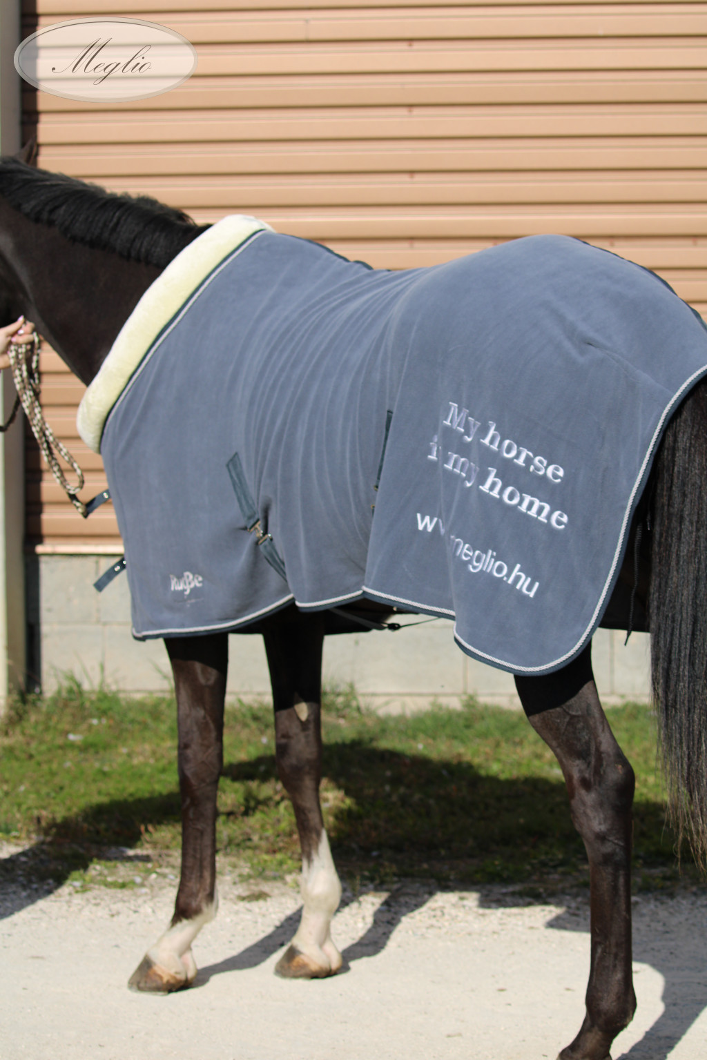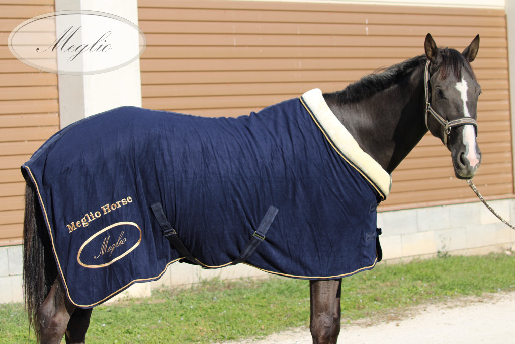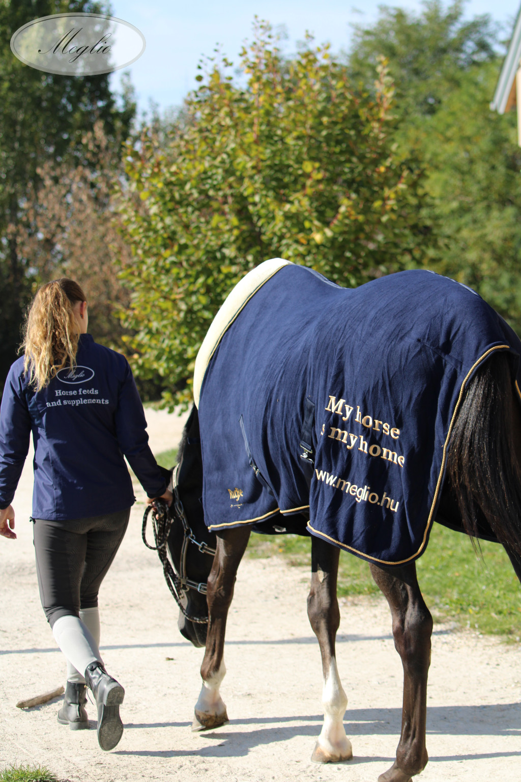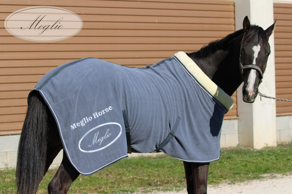 Elegant fleece horse rug with Meglio branding — lightweight yet warm, available in two colors.