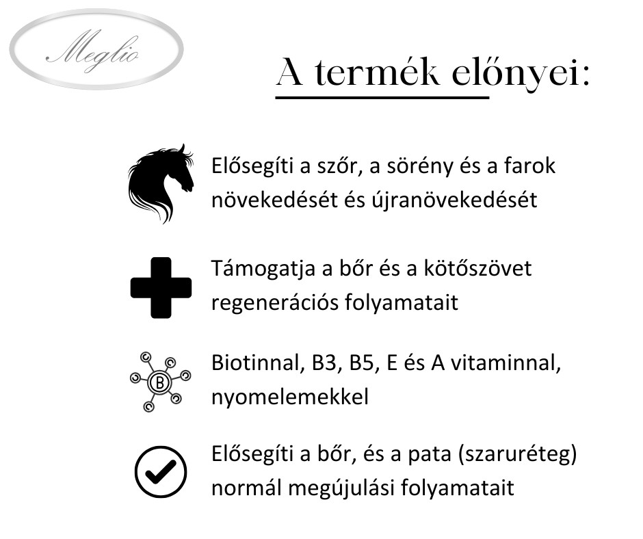 A formulában található szerves kötésű cink- és réz-kelátok kulcsszerepet töltenek be a bőr egészségében, a szőrnövekedésben és a pigmentációban. A biotin, a B3- és a B5-vitaminok összehangoltan támogatják a szőr, a sörény és a farok újranövekedését, a farok és sörény erősödését, valamint a bőr, és a pata (szaruréteg) normál megújulási folyamatait.